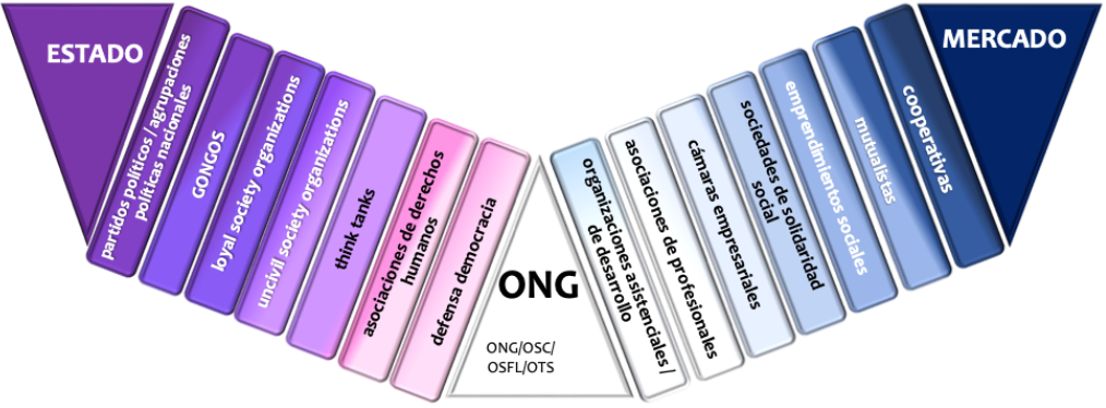 Si aceptamos la idea de que las ONGs desempeñan un papel político y uno económico, entonces podemos suponer que adoptan formatos asociativos diferentes a partir de una u otra función social. De ser así, para efectos de la explicación de esta idea, al lado izquierdo de la imagen le denominaremos “ONGs-Estado”, y al lado derecho “ONGs-Mercado”. Es en los intermedios de estas tres esferas que emergen tantas posibilidades y combinaciones asociativas como necesidades e innovaciones societales. Conocer con mayor detalle, qué tipo de ONGs son las que están en “peligro de extinción” es importante para no predecir el fin de una era asociativa, sino explicar cómo el fenómeno asociativo se ha diversificado, mutado y ha tomado formas diferentes a las que conocíamos.